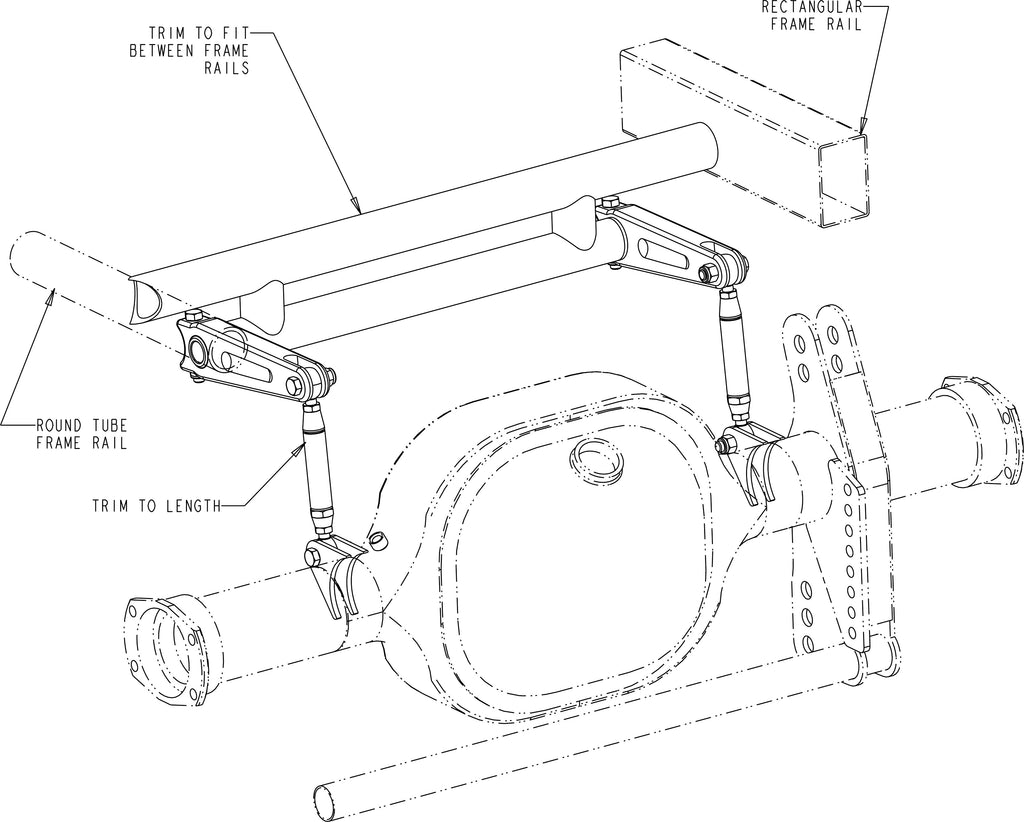 4. Determine length of link tubes with the suspension at ride height. There should be 4-5 threads showing on the rod ends past the jam nuts. It is typical for the rear housing to separate from the chassis during acceleration. To compensate for this when determining the length of the links, angle the torsion bar arm up approximately five degrees.