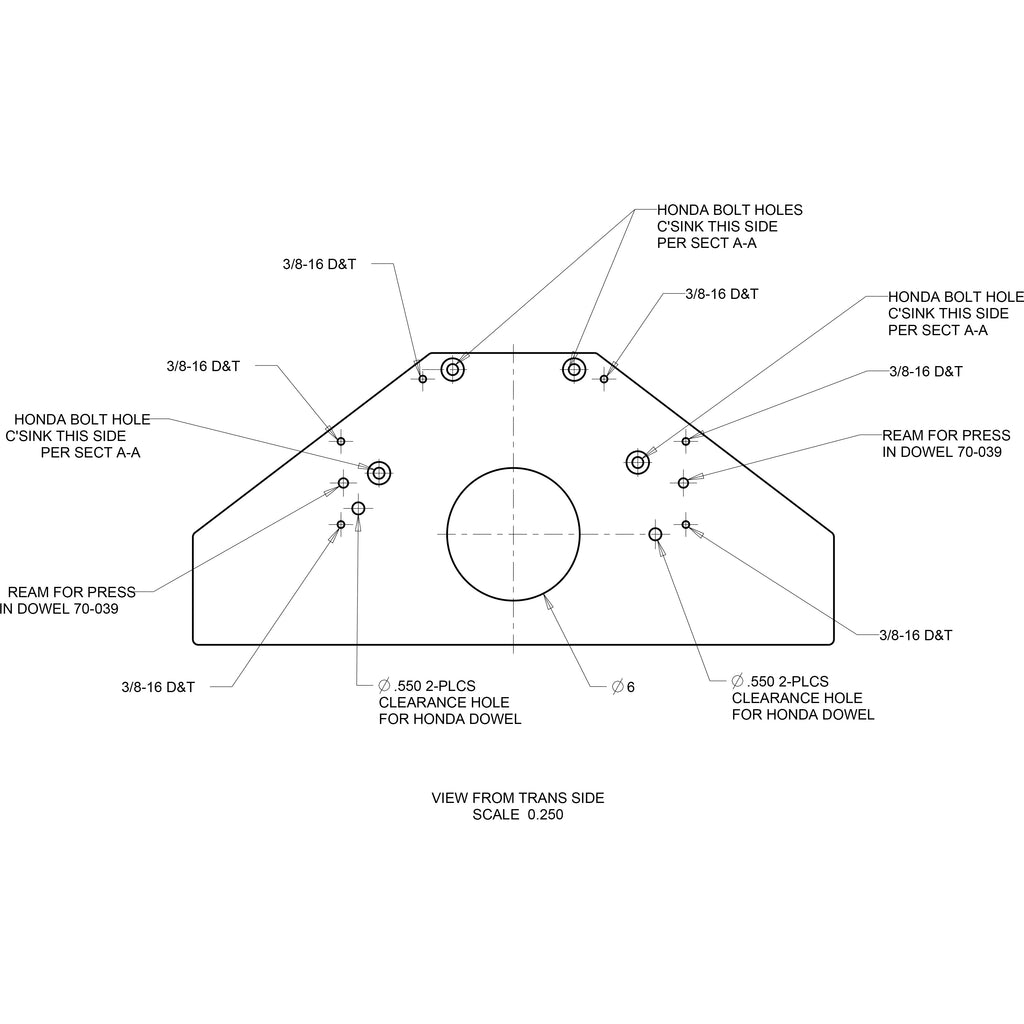 BELL HOUSING ADAPTER – HONDA VTEC TO CHEVY , 1/2? 6061 ALUM PLATE ADAPTER PLATE WITH COUNTER SUNK HOLE TO BOLT UP TO HONDA VTEC BLOCK HOLES FOR CHEVY BELL HOUSING, INCLUDES PRESS IN DOWEL PINS FOR CHEVY, NO HARDWARE INCLUDED, 29? WIDE with 6? CRANK HOLE. HONDA “B” SERIES BLOCK