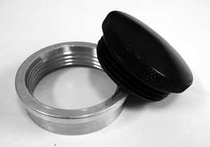 Black anodized aluminum cap and aluminum bung. 1-1/2″ diameter bung
